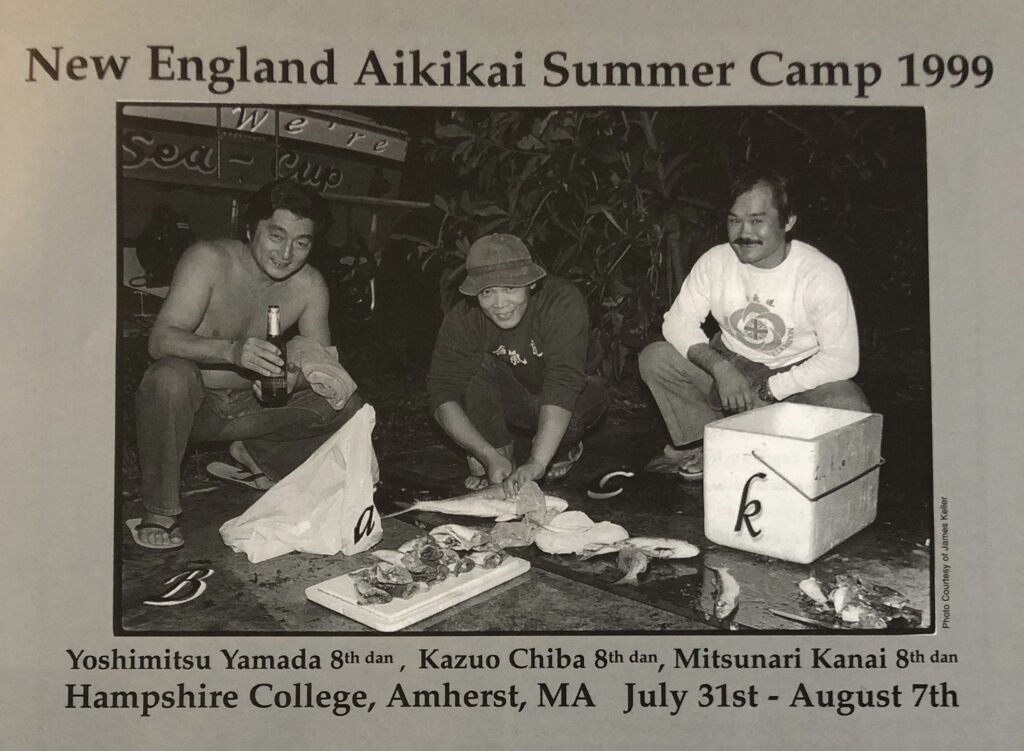 Because all three shihan came together during seminars and USAF summer camps, their students hung out together between and after practicing, which helped create close relationships throughout the U.S. I remember a few baseball games at Hampshire College where all three senseis played. Chiba Sensei could bat the ball equally well with either side. He took the game more seriously than Kanai and Yamada Senseis; he did not want to lose. At night, they’d often tell stories about learning from O’ Sensei, which you could tell made them very proud. We also had talent shows and sometimes got them laughing so hard. Being with students from all three shihans’ dojos and training together helped to build lifetime friendships and support each other in years to come.